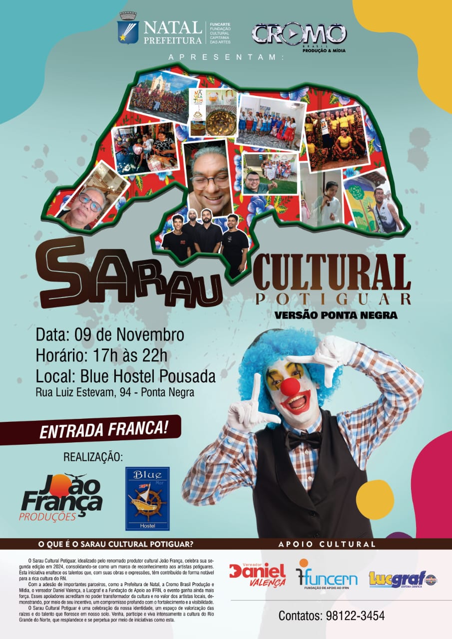 O Blue Hostel Pousada vai receber no dia 9 de novembro, um Sarau cultural cheio de atividades culturais e artisticas. O evento começa a partir das 17h e segue até as 21h, na Rua Luiz Estevam nº 94 , na Praia de Ponta Negra, e vai contar com várias modalidades artísticas envolvendo arte popular. O Sarau Cultural potiguar, idealizado pelo produtor cultural João França, pretende celebrar a identidade regional, valorizando as raizes e talentos dos artistas potiguares.