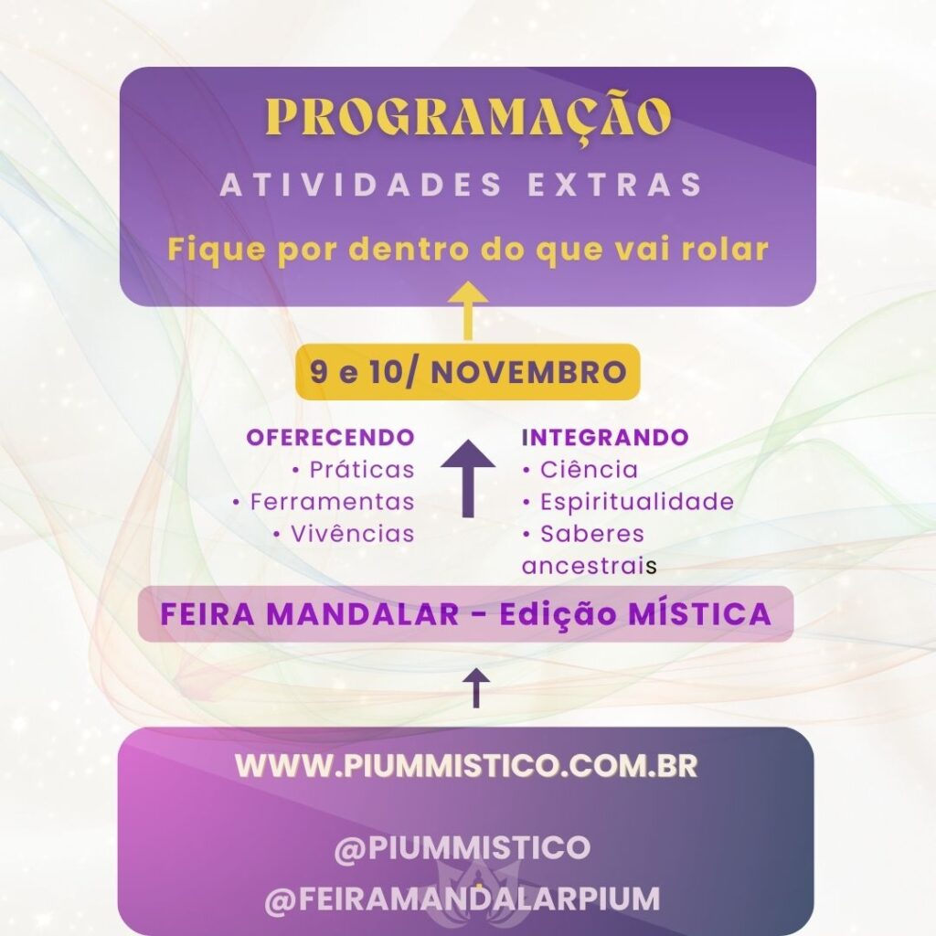 O que esperar do II Pium Místico: Experiências Interativas onde os participantes terão a oportunidade de vivenciar uma variedade de atividades envolventes, que incluem workshops, palestras e vivências práticas, todas voltadas para o autoconhecimento e o bem-estar. Seja através de práticas de meditação, técnicas de respiração ou oficinas de arte terapêutica, cada atividade é pensada para despertar a essência interior e promover um profundo processo de transformação pessoal.