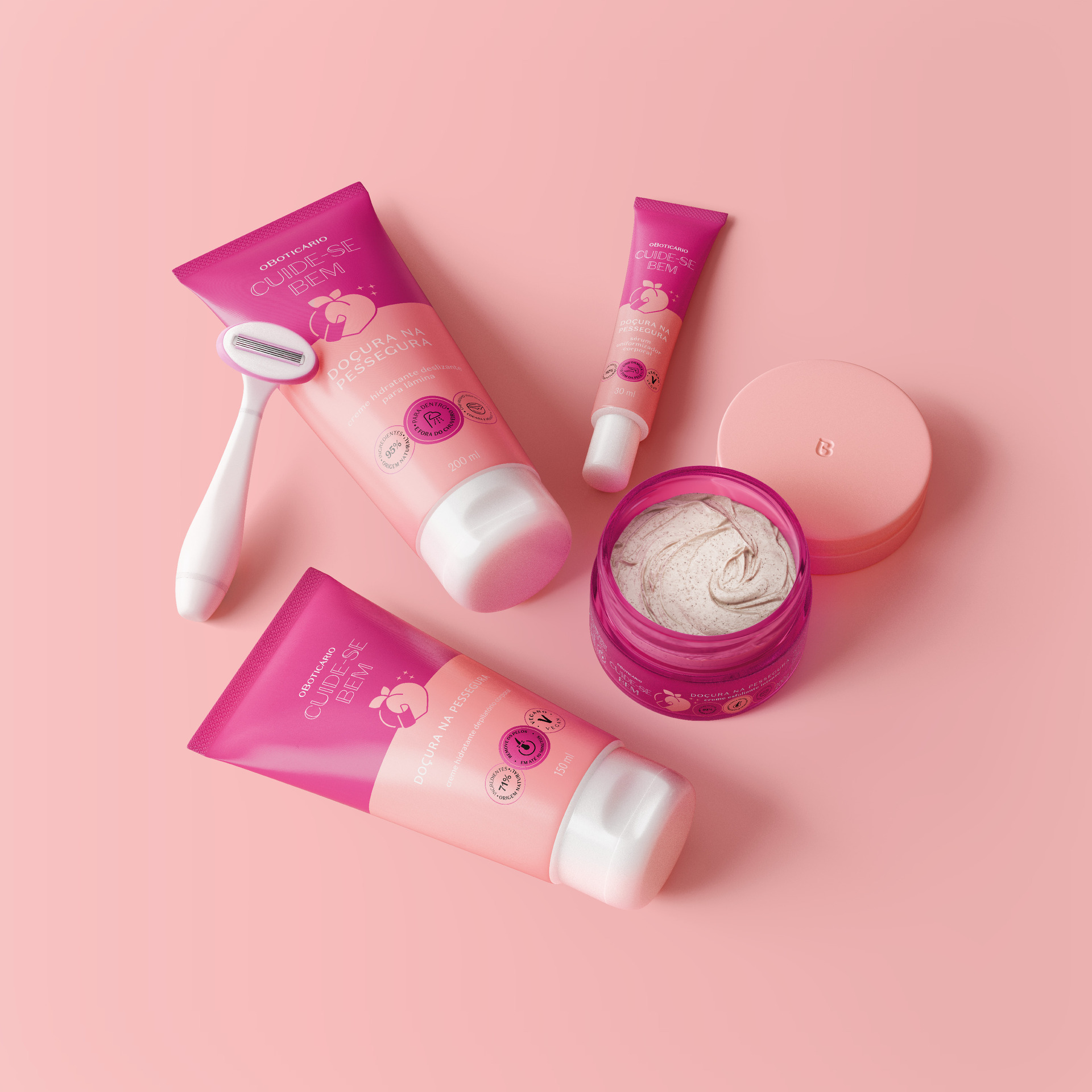 Pensado para oferecer uma experiência de cuidado completa, o portfólio foi desenvolvido para envolver todas as etapas do pré, durante e pós depilatório. “Cuide-se Bem é a nossa marca que mais estreia em diferentes categorias, e Cuide-se Bem Doçura na Pessegura é um movimento inédito para nós, que além de representar a estreia no mercado depilatório é mais uma iniciativa alinhada ao compromisso de expandir as ocasiões de uso dos produtos e ponto de contato com o consumidor. Com esse lançamento, oferecemos uma nova perspectiva sobre um momento que antes era amargo para quem opta por se depilar e agora pode ser leve e indolor, além de ter um grande diferencial com uma fragrância docinha e deliciosa, que se afasta do aroma incômodo já conhecido de produtos depilatórios”, comenta Bruna Nunes, diretora da categoria Corpo & Banho do Grupo Boticário.