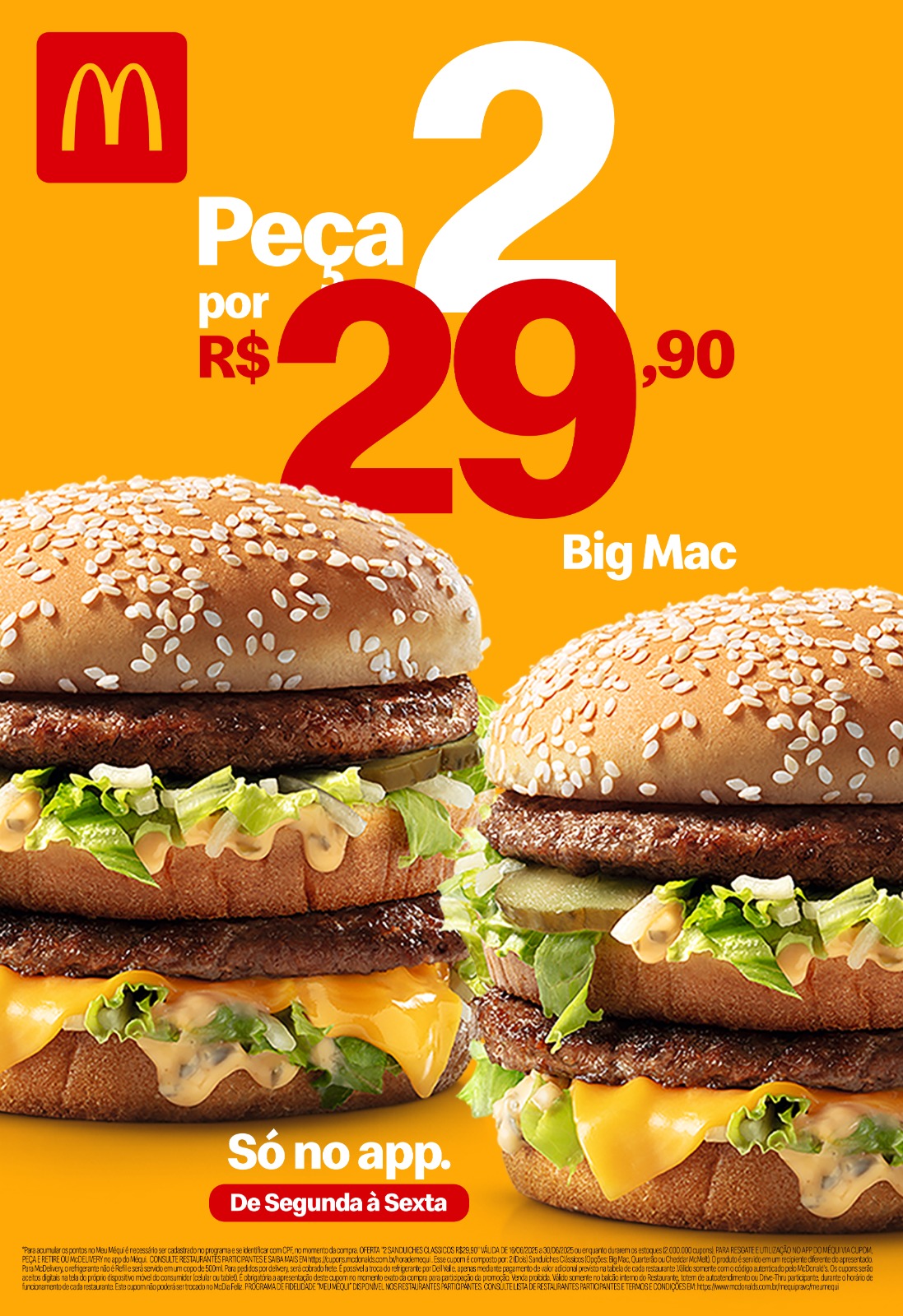 Sabe quando bate aquela vontade específica, que só um Big Mac resolve? Ou quando o jogo do seu time vai começar e tudo o que você quer é um Quarterão na mão? São nesses momentos que a gente sabe que é Hora de Méqui! A partir de hoje o McDonald’s convida todo mundo a curtir seus clássicos favoritos com promoções irresistíveis. O destaque vai para os fãs dos ícones do cardápio, que podem aproveitar 2 Big Mac, 2 Cheddar McMelt ou 2 Quarterão por apenas R$29,90. A oferta é ativada por meio de cupom no app e válida de segunda a sexta-feira nos totens de autoatendimento dos restaurantes, no drive-thru e no Peça e Retire.