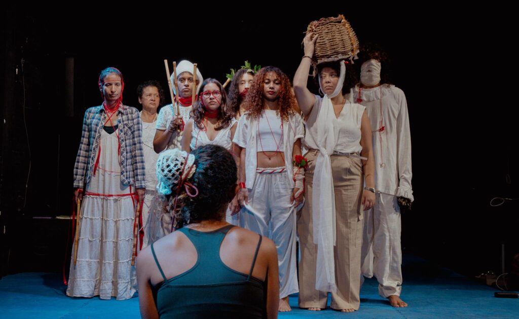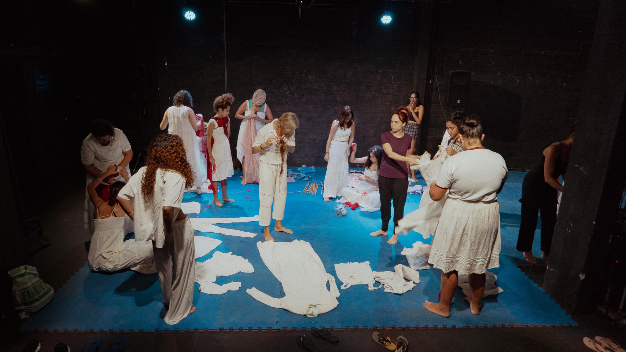 “Ao longo da oficina, propusemos inicialmente a leitura de “Titus Andronicus”, para que cada mulher pudesse compreender o universo de onde parte Lavínia. A partir disso, criamos um texto coletivo imaginário, baseado nas experiências, nas palavras e nos depoimentos que surgiram. Trabalhamos com exercícios de corpo e composição coreográfica, improvisações a partir dos figurinos, e investigações sobre como o corpo se posiciona no espaço. A ideia foi construir juntas — respeitando os diferentes níveis de experiência — uma performance que falasse das múltiplas violências sofridas por mulheres, sem perder nenhum dos materiais subjetivos que emergiram nesse encontro”, explica Mainá Santana, uma das diretoras da intervenção urbana.