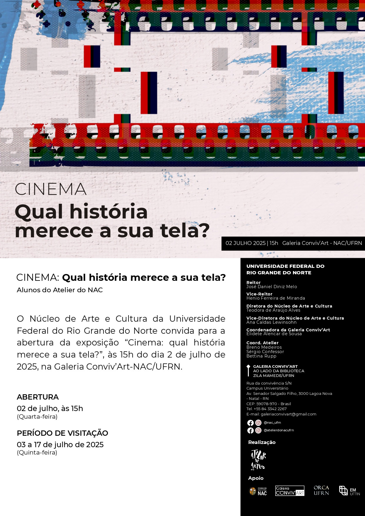 O Núcleo de Arte e Cultura (NAC) realiza na próxima quarta-feira (2), a abertura da exposição “Cinema: qual história merece a sua tela?”, que acontecerá a partir das 15h, na Galeria Conviv’Art – NAC/UFRN.