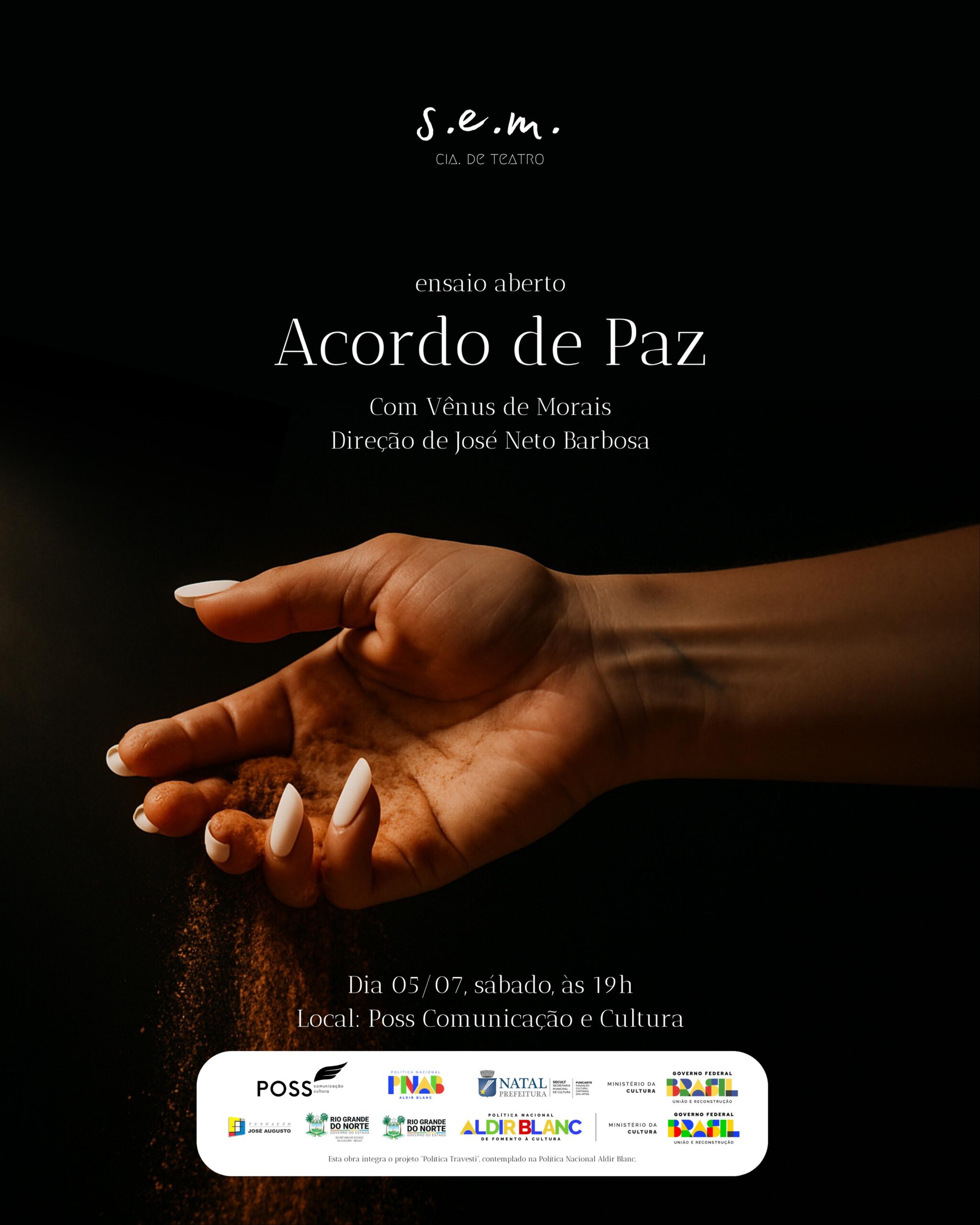 O público poderá acompanhar no próximo dia 05 de julho, a partir das 19h, o processo criativo do novo espetáculo da S.E.M. Cia. de Teatro, “Acordo de Paz”. Com direção de José Neto Barbosa e atuação de Vênus de Morais, da cidade de Acari/RN. A sessão ocorre neste sábado, 5 de julho, às 19h, na sede da companhia e da Poss Comunicação e Cultura, na Av. Maria Lacerda Montenegro, 2074 (CEP 59152-600).