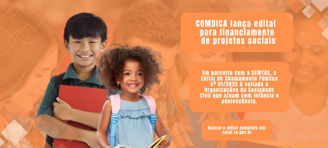O Conselho Municipal dos Direitos da Criança e do Adolescente (Comdica), em parceria com a Secretaria Municipal do Trabalho e Assistência Social (SEMTAS), lançou, nesta quarta-feira (2), o Edital de Chamamento Público nº 01/2025, que abre seleção para o financiamento de projetos sociais voltados à infância e adolescência no município do Natal.