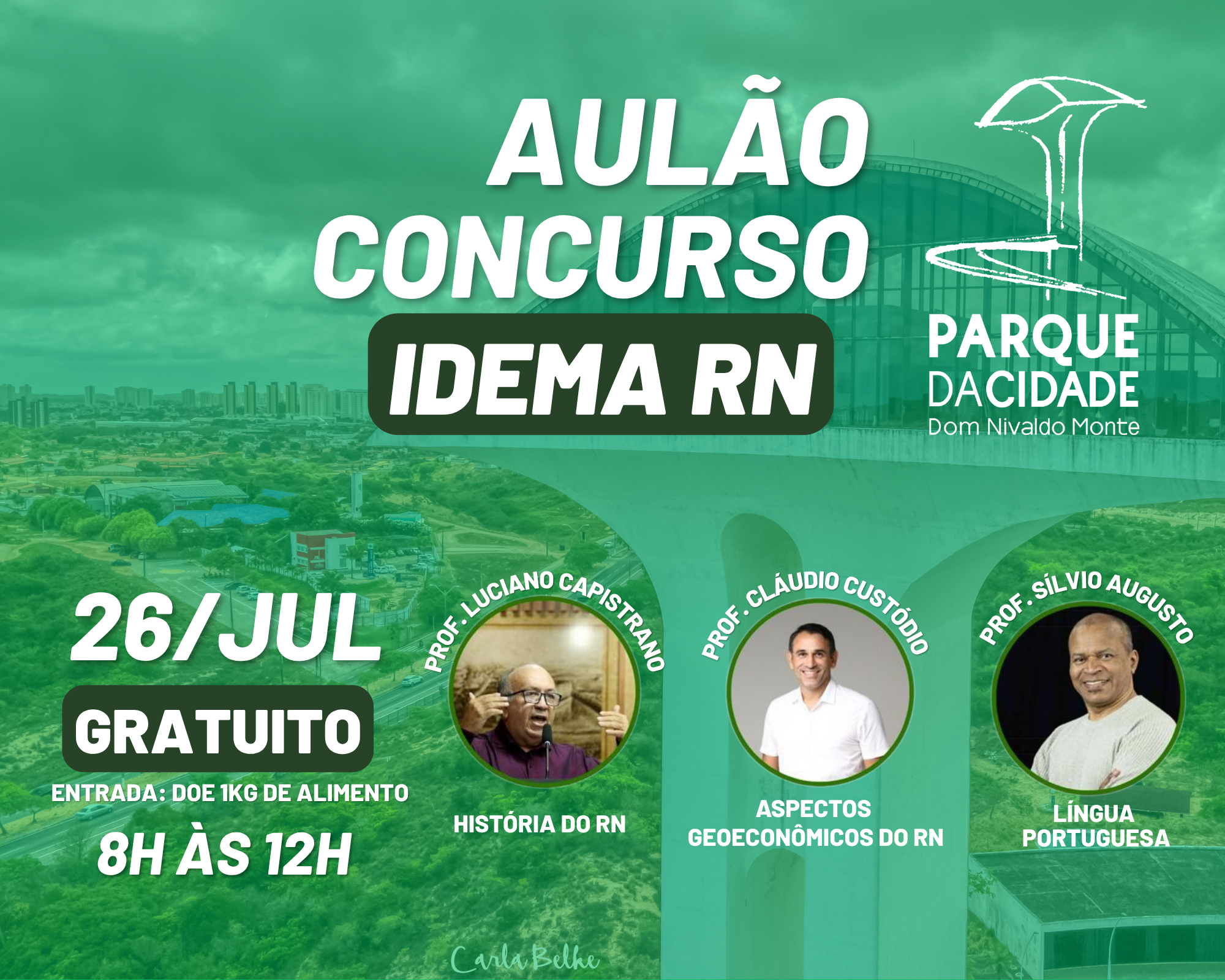 A Prefeitura do Natal, por meio da Secretaria Municipal de Meio Ambiente e Urbanismo (Semurb), realiza, no sábado, 26 de julho, um aulão de revisão para os candidatos do concurso público do Instituto de Desenvolvimento Sustentável e Meio Ambiente (Idema). A atividade acontece no auditório do Parque da Cidade Dom Nivaldo Monte, das 8h às 12h.