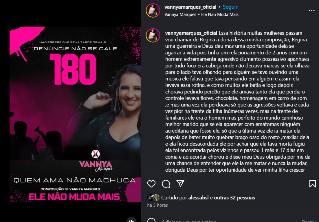 Com a mensagem “Quem ama não machuca”, a composição reforça a importância da denúncia, destacando o canal nacional de apoio às mulheres em situação de violência, o Disque 180. A divulgação traz um alerta direto: