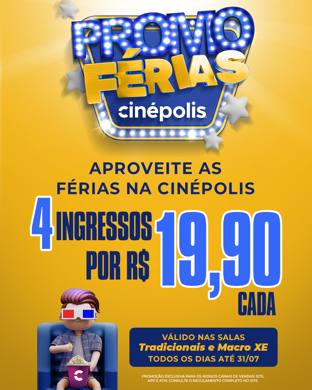 A promoção é válida para compras realizadas nos canais oficiais da Cinépolis (site, app ou bilheterias físicas), até o dia 31 de julho de 2025. Para mais informações, consulte a unidade mais próxima ou acesse: www.cinepolis.com.br.