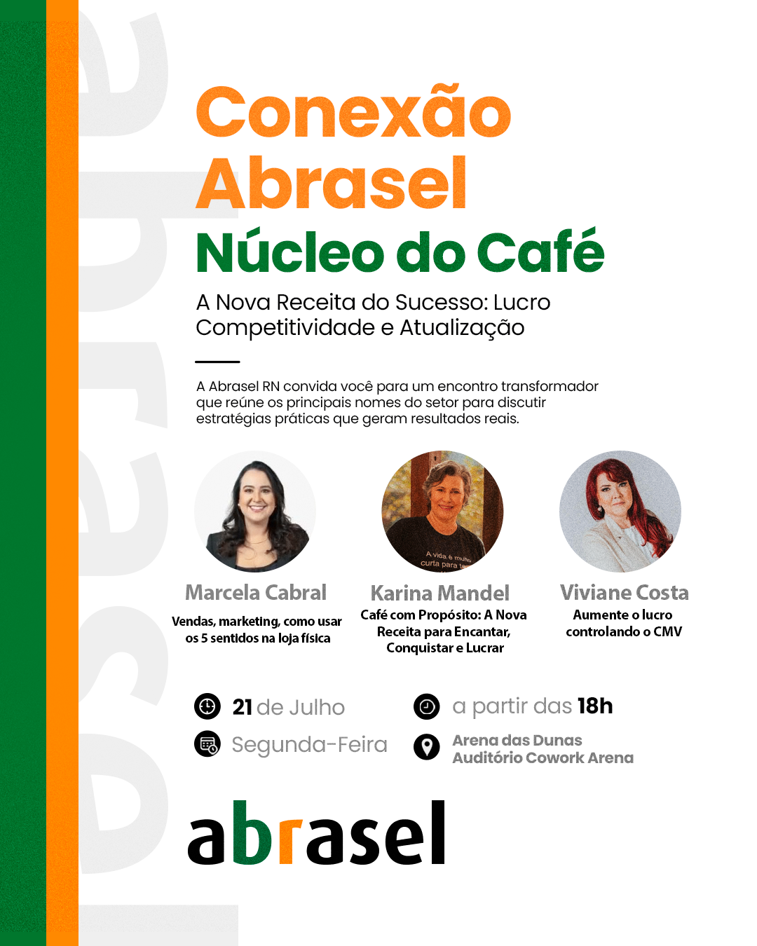 A Abrasel RN convida você para um encontro exclusivo com os principais nomes do setor, voltado para cafeterias, padarias, docerias e fornecedores. O evento Conexão Abrasel – Núcleo do Café acontece nesta segunda-feira (21), a partir das 18h no Auditório Cowork Arena, na Arena das Dunas. Nesta edição, a organização vamos reunir conteúdos práticos e estratégicos para gerar mais resultados, melhorar a experiência do cliente e aumentar o lucro, nesse segmento. O evento é gratuito e vai contar uma programação variada, com a presença de Marcela Cabral – Como usar os 5 sentidos para vender mais; Karina Mandel (Diva do Café) – Café com propósito: encantar e lucrar e ainda Viviane Costa – Como controlar o CMV e melhorar o lucro. As inscrições podem ser feitas pelo link !