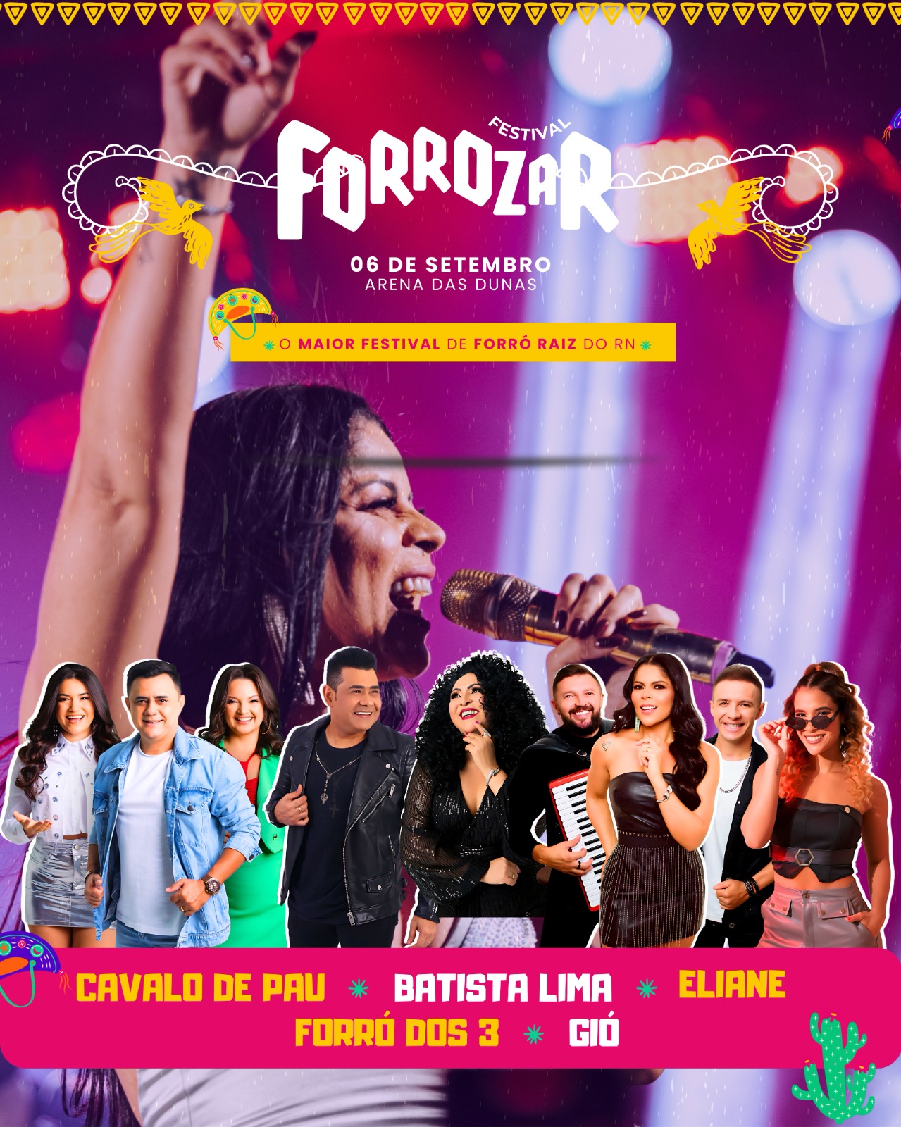 Entre as atrações já confirmadas estão Batista Lima, um dos maiores intérpretes do forró romântico; Eliane, a consagrada “Rainha do Forró”, com 42 anos de carreira e uma trajetória marcada por sucessos como Brilho da Lua, Valeu e Amor ou Paixão; a banda Cavalo de Pau, ícone do forró tradicional; além do grupo Forró dos 3 e da cantora Gió, que trazem o talento potiguar para o palco do festival.