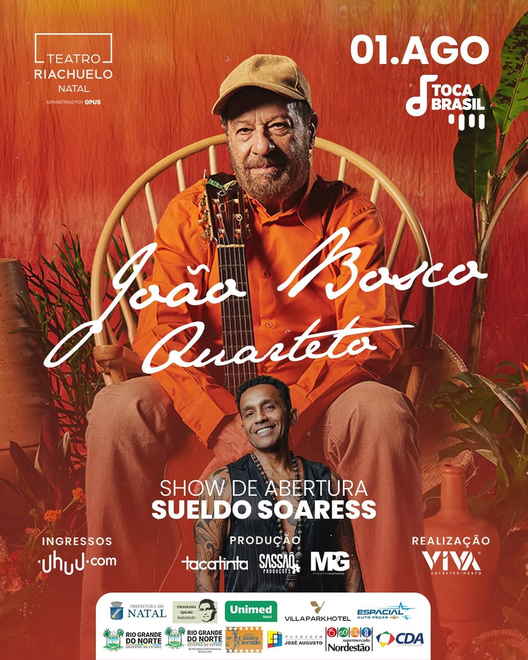 A noite conta ainda com a apresentação do cantor e compositor potiguar Sueldo Soaress, que traz um repertório autoral com fortes influências da música nordestina. A participação integra o Projeto Toca Brasil, iniciativa que valoriza a conexão entre artistas consagrados e talentos regionais.