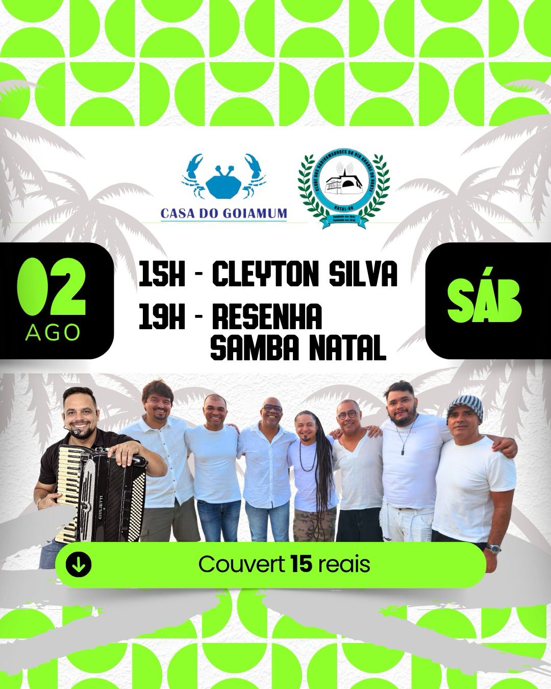 Atrações: 15h – Cleyton Silva / 19h – Grupo Resenha Samba Natal