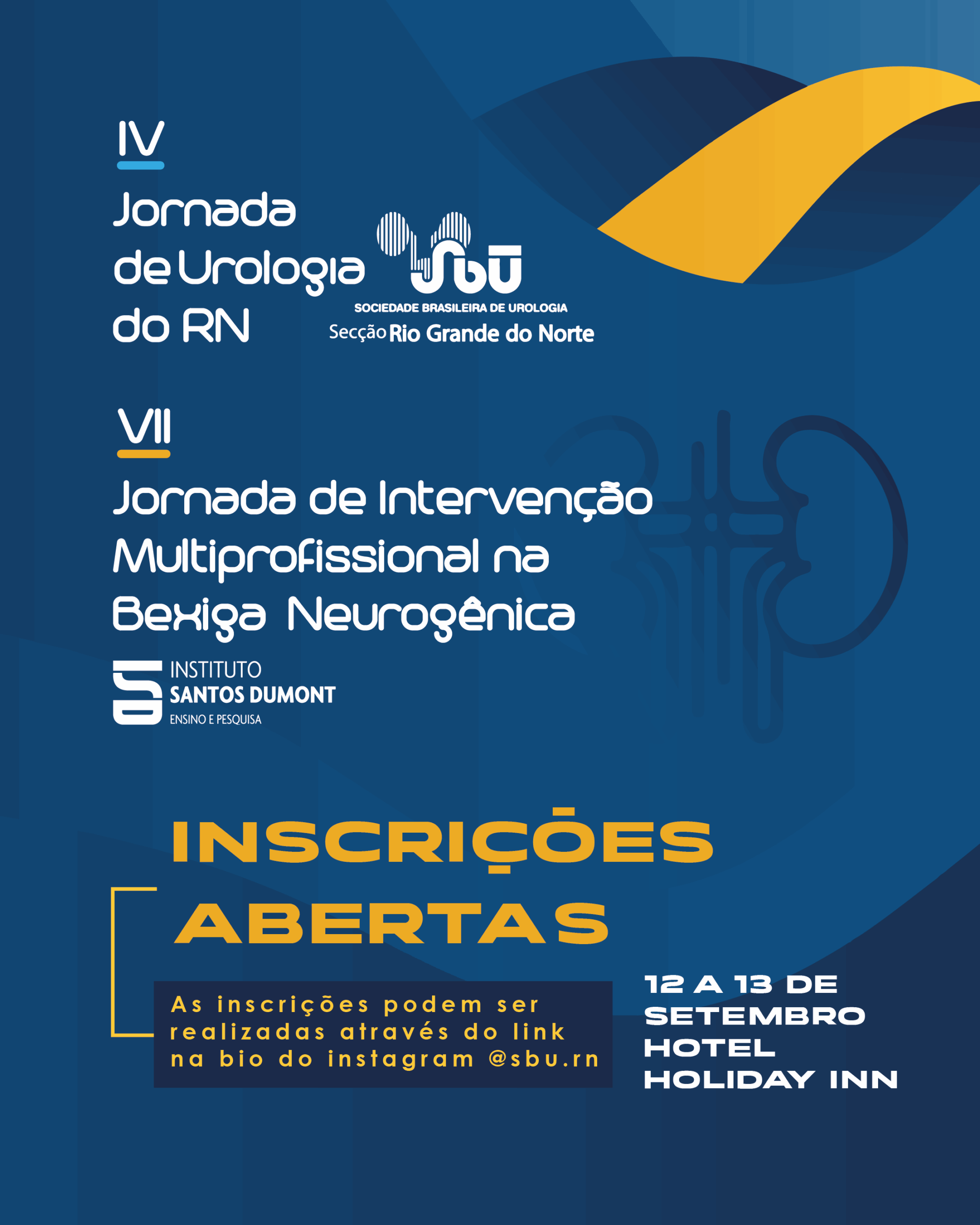 Estão abertas as inscrições para a IV Jornada de Urologia do RN e VII Jornada de Intervenção Multiprofissional na Bexiga Neurogênica. Os eventos são realizados pela Sociedade Brasileira de Urologia, seccional do RN (SBU-RN), e pelo Instituto Santos Dumont (ISD), respectivamente. As jornadas vão acontecer nos dias 12 e 13 de setembro, no Hotel Holiday Inn, em Natal-RN.