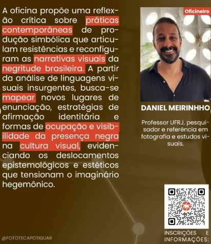 No dia 18 de agosto, das 09h às 12h, na Sala 01 – DECOM/UFRN, vai acontecer uma oficina que propõe uma reflexão crítica sobre práticas contemporâneas de produção simbólica que articulam resistências e reconfiguram as narrativas visuais da negritude brasileira.