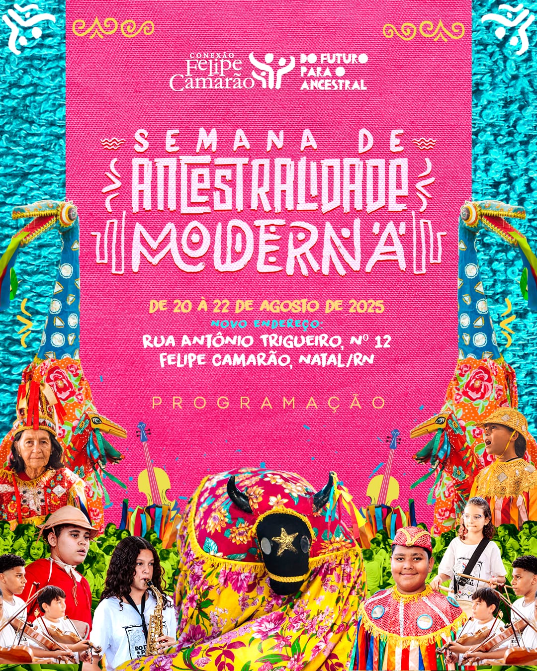 A partir desta quarta-feira (20) até o dia 22 de agosto, a Escola de Saberes Conexão Felipe Camarão, localizada em novo endereço (Rua Antônio Trigueiro, nº 12A – bairro Felipe Camarão, Natal/RN), será palco da Semana de Ancestralidade Moderna, uma celebração à cultura popular, às memórias vivas e aos saberes ancestrais que seguem pulsando na contemporaneidade.