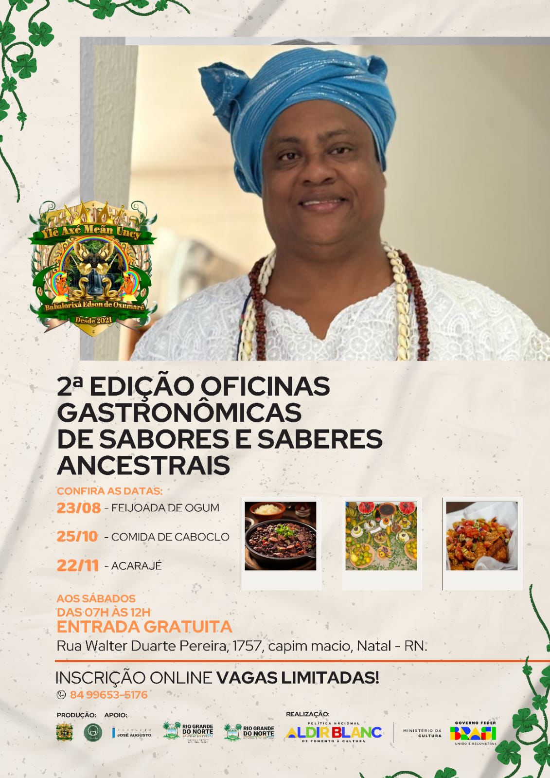 As oficinas são gratuitas e serão ministradas por Edson de Oxumarê, Babalorixá e especialista em gastronomia de terreiro, conhecido como Ed do Acarajé. Ele compartilhará sua vasta experiência e conexão com as tradições afro-brasileiras, promovendo um espaço de aprendizado, fortalecimento cultural e muito sabor.