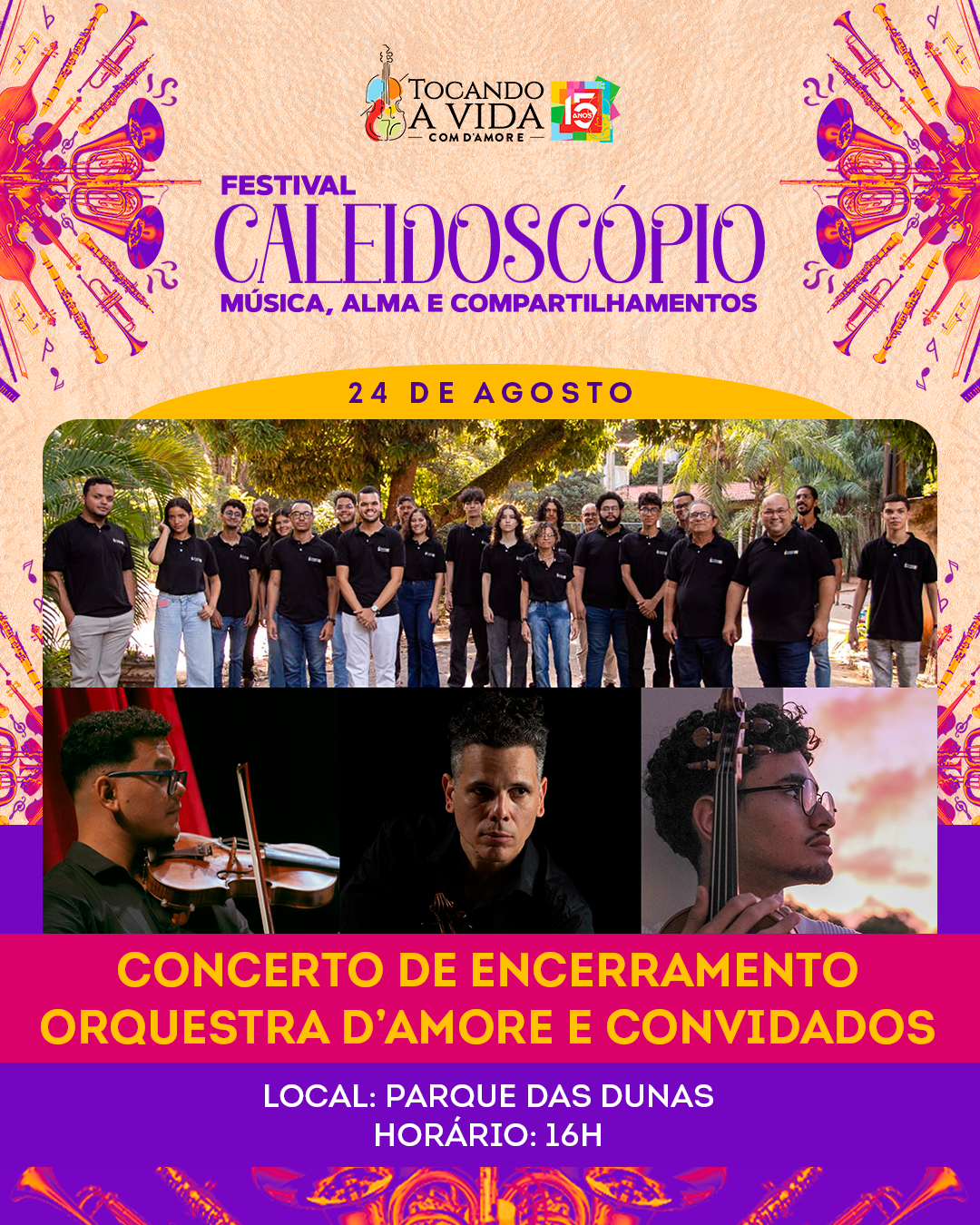 O Festival se despede no domingo, 24 de agosto, às 16h, com um concerto ao ar livre no Parque das Dunas. A apresentação da Orquestra D’Amore e convidados une jovens talentos e músicos experientes em uma celebração aberta à cidade.