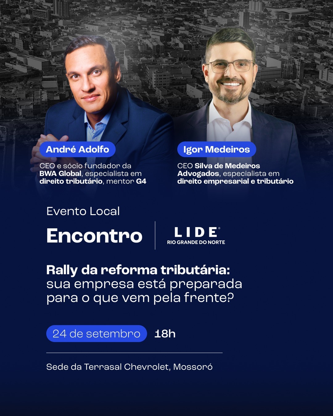 O LIDE Rio Grande do Norte realiza no próximo dia 24 de setembro, às 18h, na sede da Terrasal Chevrolet, em Mossoró, um encontro exclusivo com foco em um dos temas mais urgentes para o ambiente de negócios: a reforma tributária.