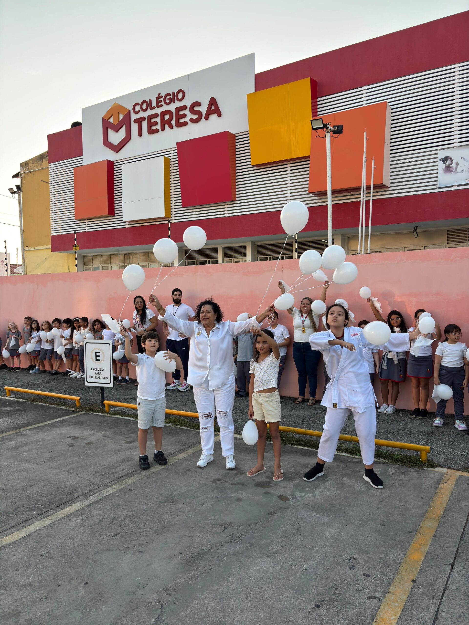 O momento foi marcado por atividades de reflexão, partilha e um gesto simbólico emocionante: o abraço coletivo à escola, acompanhado por balões e lenços brancos, representando a unidade, a esperança e o desejo por um mundo mais fraterno.