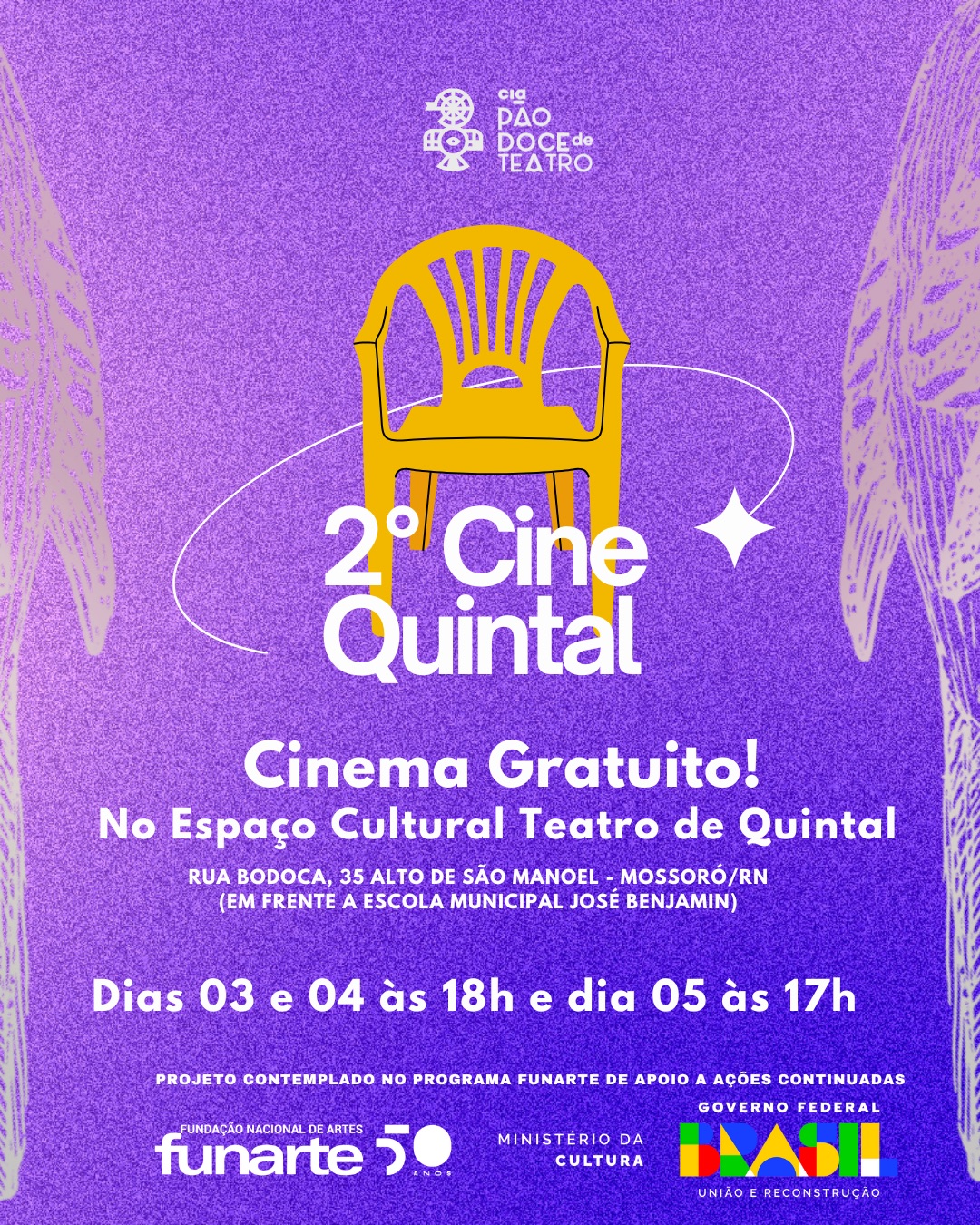 Com programação gratuita e aberta ao público, o Cine Quintal integra o projeto Cia. Pão Doce 20 anos – segunda edição, contemplado e renovado no Programa FUNARTE de Apoio a Ações Continuadas.