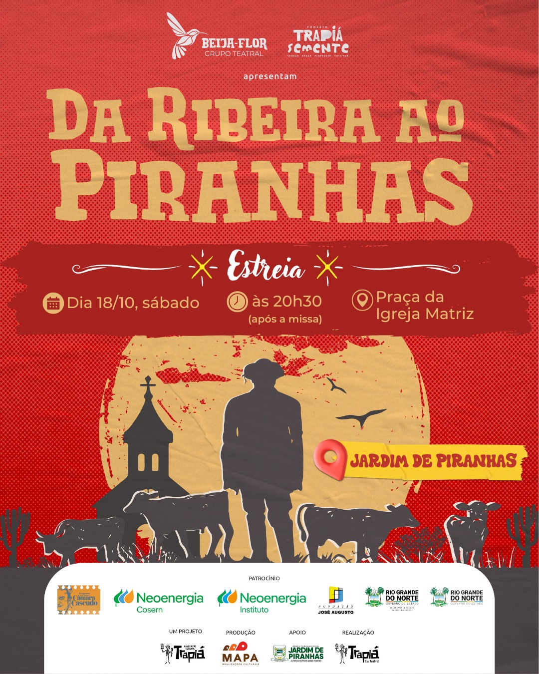 O espetáculo “Da Ribeira ao Piranhas”, do Grupo Teatral Beija-Flor, de Jardim de Piranhas, estreia no próximo dia 18, às 20h30, na Praça da Igreja Matriz.