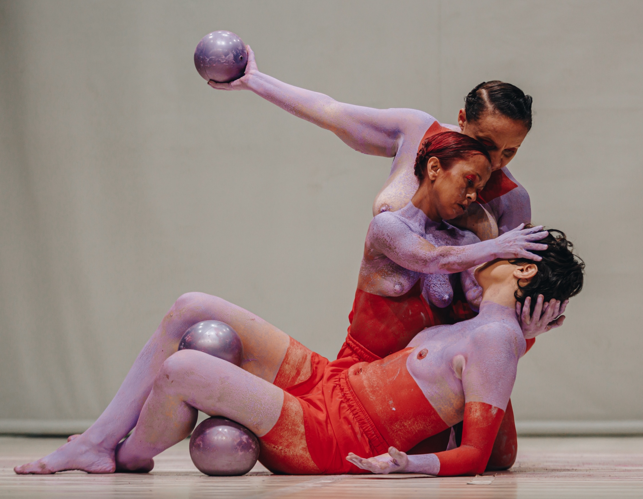 Em “Graça”, o grupo se debruça sobre narrativas que desafiam arquétipos de beleza, fertilidade e êxtase. Inspirada em mitologias que atribuem aos corpos femininos múltiplas qualidades e possibilidades, a montagem reúne três bailarinas em cena que entrelaçam movimentos, erotismo e camadas de tinta lilás e vermelha.