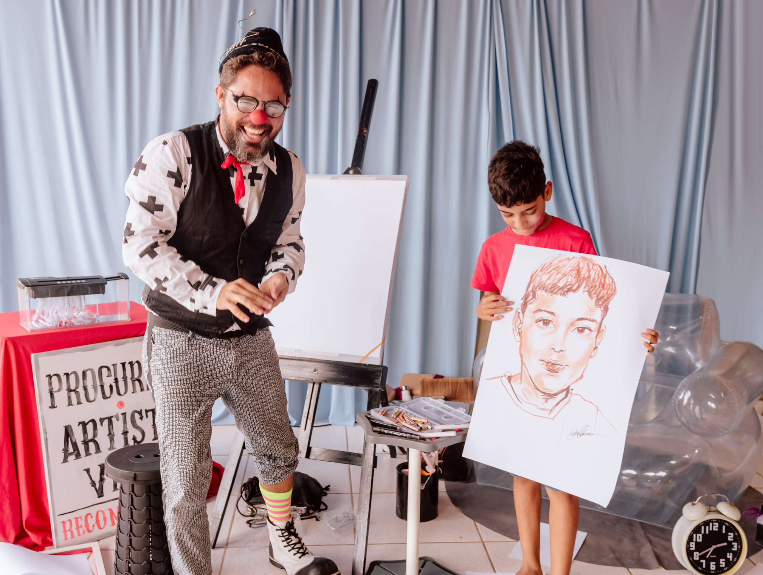 “Buscar companhia para o ato de criar e desenhar diante do público foi o que motivou a construção do personagem. A palhaçaria apareceu como uma ferramenta para sair da solitude do ateliê. Desde então, venho aprofundando essa pesquisa, realizando oficinas e experimentações que me levaram ao palco com *Riscado*”, comenta o artista.