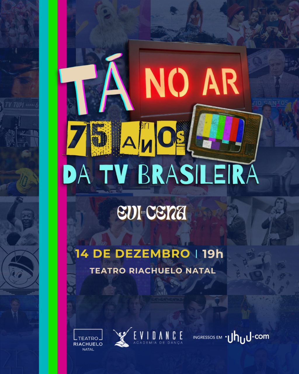 Em 18 de setembro de 2025, a TV Brasileira completa seus 75 anos de muitas histórias e emoções. Inspirada nessa trajetória e em suas diversas nuances, a Evidance, através da 8ª edição do Evi em Cena, traz ao palco do Teatro Riachuelo o espetáculo “Tá no ar: 75 anos da TV Brasileira”.