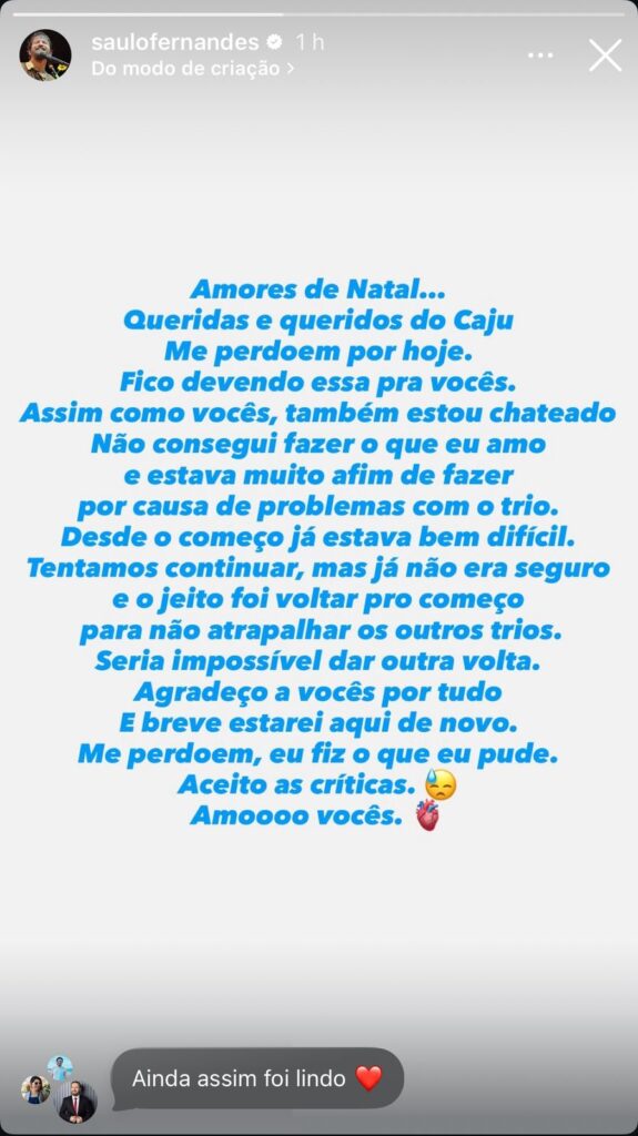 A nota foi publicada no storie do cantor Saulo. Confira na integra, o texto: