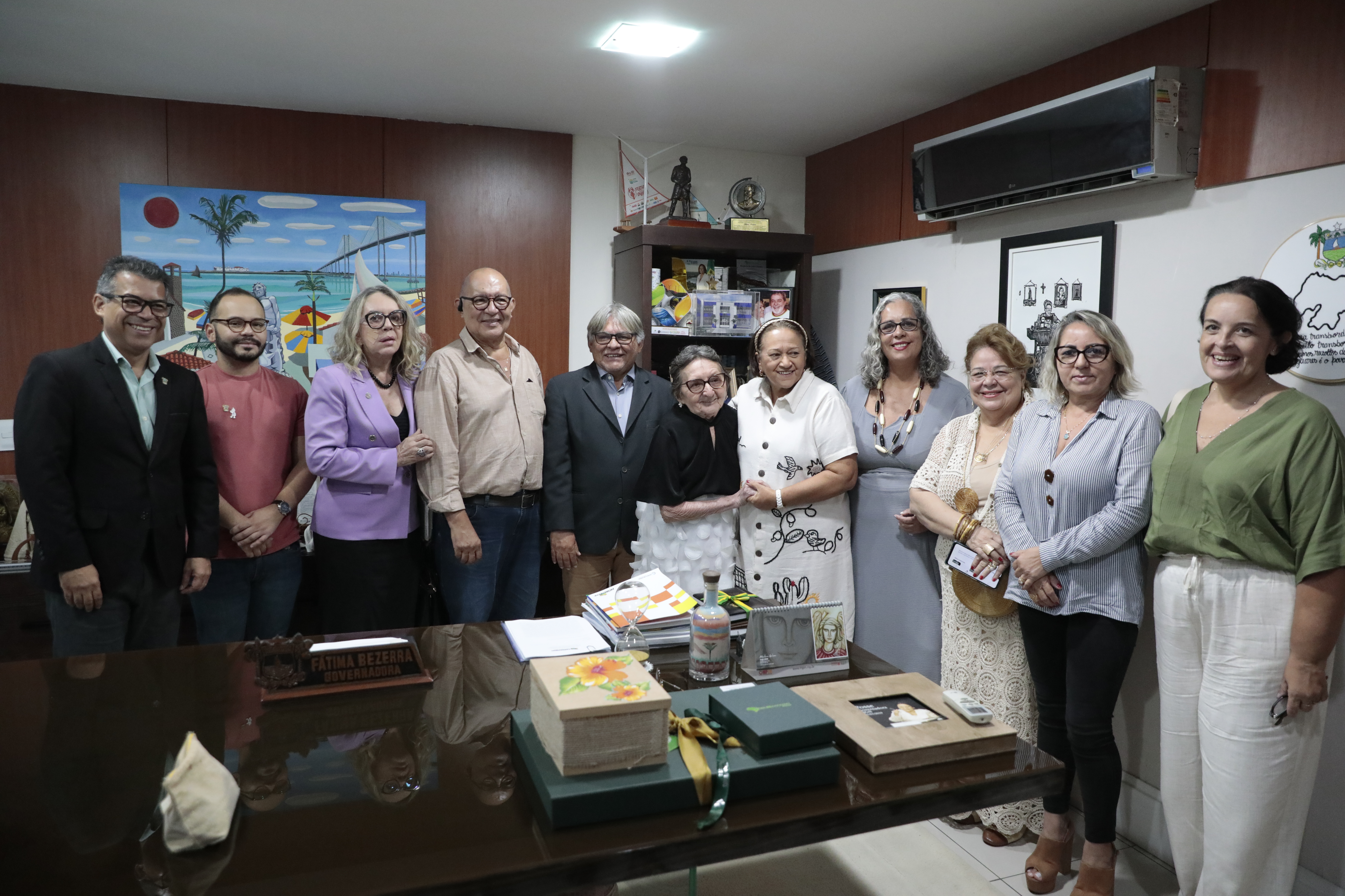 A governadora Fátima Bezerra recebeu, nesta quarta-feira (10), em seu gabinete, a atriz e artesã Tânia Maria, que se destacou no filme de Kleber Mendonça Filho, O Agente Secreto. A atriz de 78 anos acabara de receber a Medalha do Mérito Cultural Câmara Cascudo, na Assembleia Legislativa, e dirigiu-se ao encontro da governadora.
