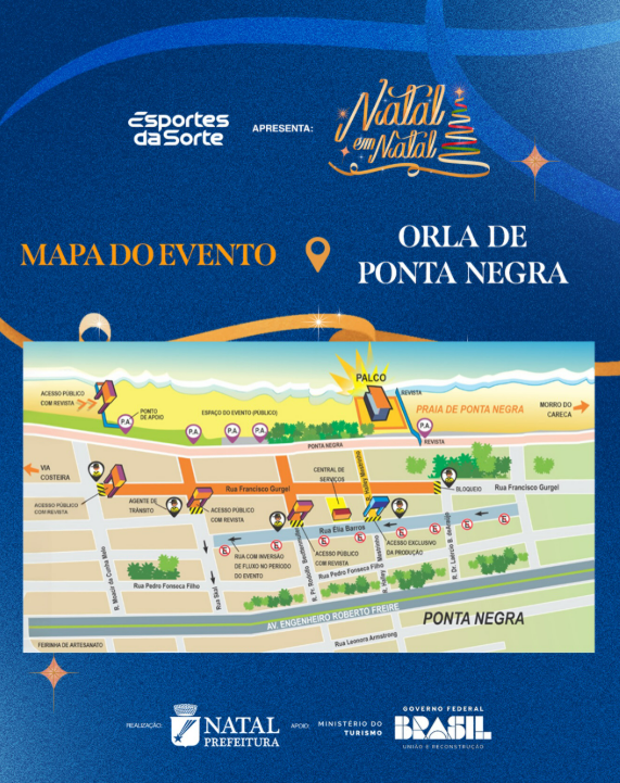 A Prefeitura do Natal divulgou um mapa de acesso, onde o público vai poder conferir as melhores rotas para conferir os shows na Praia de Pontra Negra, que iniciam nesta quinta-feira (25). Alguns trechos que dão acesso a praia serão interditados, e outros contaram com ponto de revista para os frequentadores do evento, bem como serão realizados vistorias nos coolers. O indicado é que o público encontr formas alterantivas de chegar o evento, evitando o uso de carros particulares, devido as interdições.