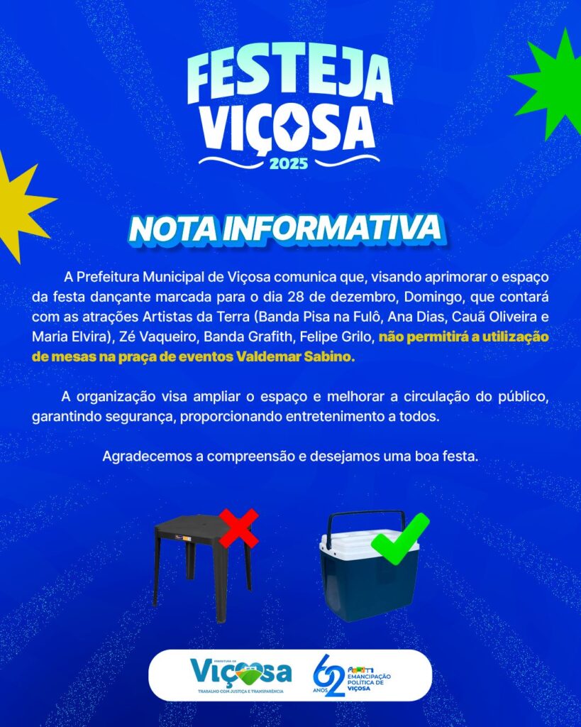 A Prefeitura Municipal de Viçosa informa que, com o objetivo de aprimorar a organização e garantir maior conforto, segurança e melhor circulação do público durante a festa dançante em comemoração aos 62 anos de Emancipação Política, que acontecerá neste domingo, 28 de dezembro, na Praça de Eventos Valdemar Sabino, não será permitida a utilização de mesas no local do evento. A medida visa ampliar o espaço disponível para o público e assegurar que todos possam aproveitar a programação com tranquilidade e segurança.