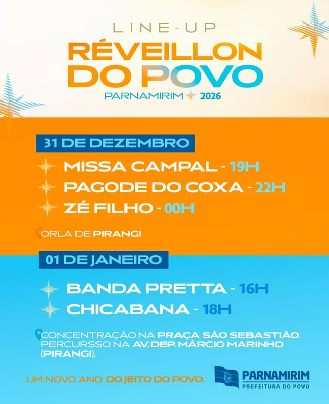 A Prefeitura de Parnamirim, por meio da SETUDE, divulgou como vai funcionar a festa de fim de ano no municipio. A programação vai se concentrar na Praia de Pirangi no Litoral sul, do estado. A festa deve contar com a presença de moradores, visitantes e ambulantes para celebrar a chegada de 2026 com alegria, responsabilidade e segurança.