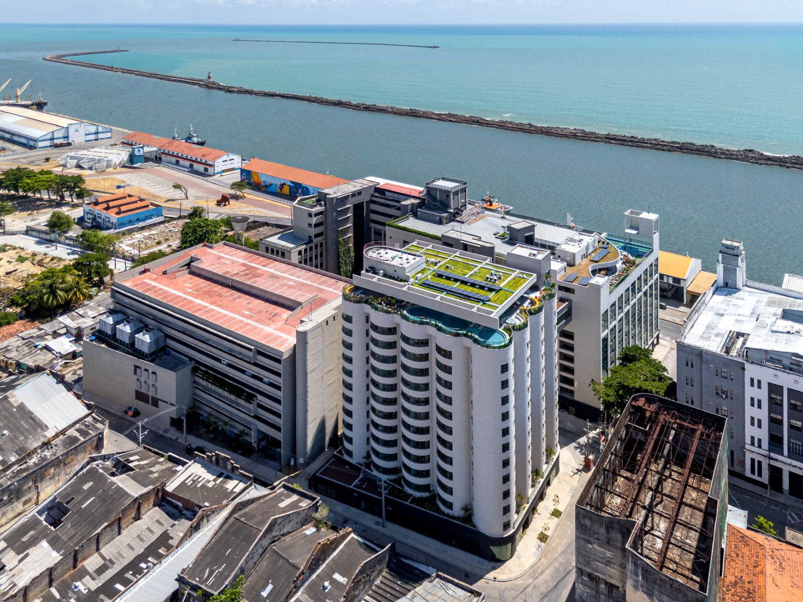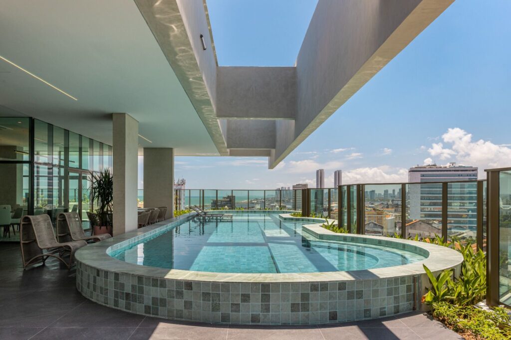 As tipologias preservam, de forma autêntica, o formato original dos antigos depósitos de trigo do Moinho Recife, mantendo a volumetria, as curvas e a geometria que caracterizam os silos centenários. Essa integração entre memória industrial e arquitetura contemporânea se estende às áreas comuns, que incluem rooftops conectados por passarela, piscinas aquecidas, lounge bar, academia, salão de festas, espaços de convivência e vistas amplas para o mar e para o tecido histórico da cidade.