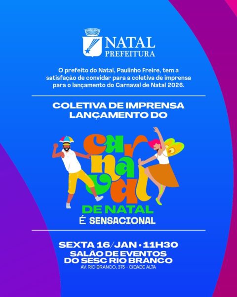 A prefeitura do Natal convida a imprensa para a coletiva de lançamento oficial do Carnaval de Natal 2026, que será realizada nesta sexta-feira (16), às 11h30, no Salão de Eventos do Sesc Rio Branco, na Cidade Alta. Na ocasião, serão apresentadas a programação e as diretrizes da festa, uma das principais manifestações culturais e turísticas da capital potiguar.