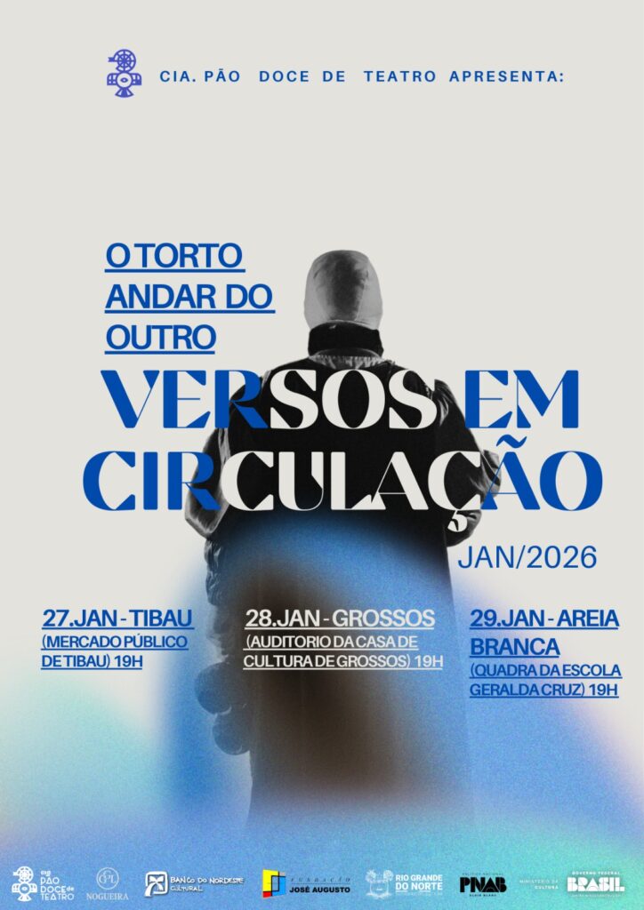 A Cia. Pão Doce de Teatro realiza nesta última semana de janeiro de 2026, o espetáculo “O Torto Andar do Outro” dentro do projeto “Versos em Circulação”. O projeto integra um circuito de apresentações gratuitas em três cidades da Costa Branca potiguar, ampliando o acesso à arte e fortalecendo a circulação teatral na região litorânea em Tibau, Grossos e Areia Branca, através da GGL Nogueira Produções com apoio da Fundação José Augusto (Governo do Estado do Rio Grande do Norte), Política Nacional Aldir Blanc (Ministério da Cultura) – Governo Federal.