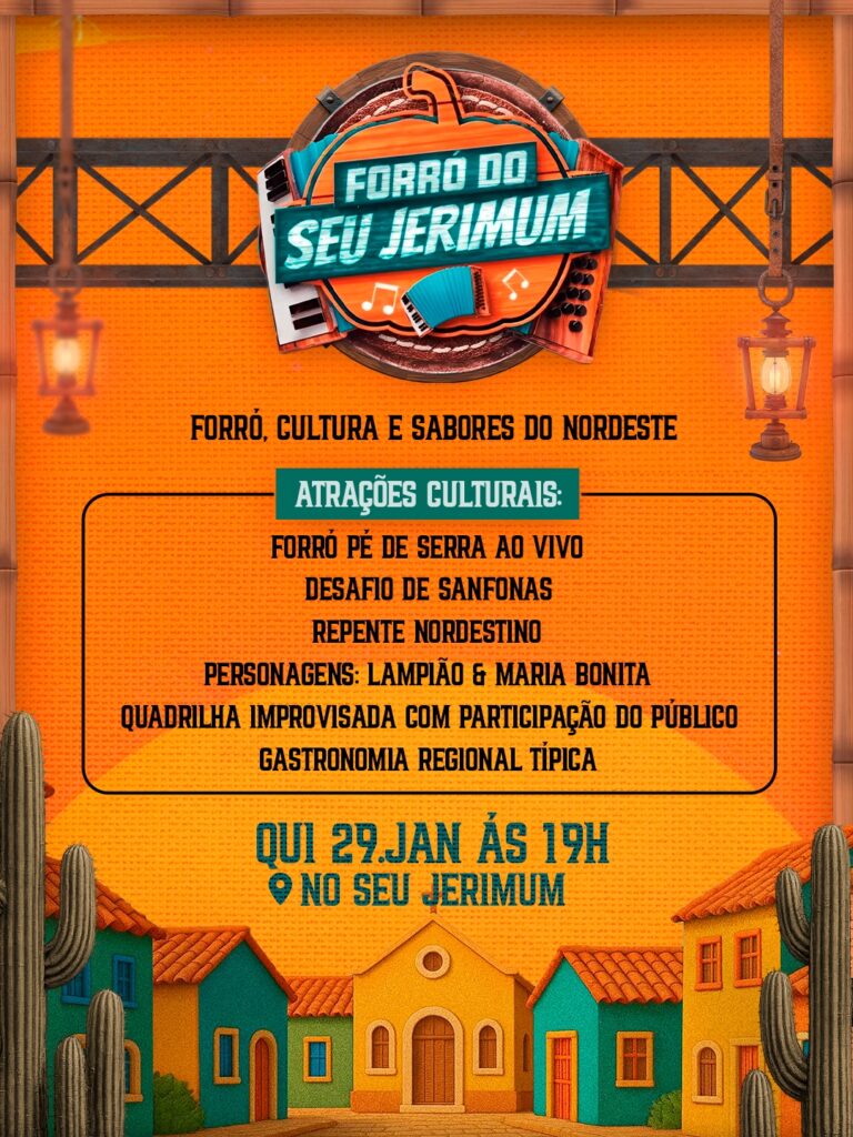 O “Forró do Seu Jerimum” é um projeto cultural que promove uma verdadeira imersão na cultura nordestina, unindo música, dança e gastronomia regional. Com um espaço amplo, ambiente renovado e decoração especial, o Seu Jerimum se une à equipe do antigo “forró com o turista” em um resgate da tradição do forró nas quintas-feiras em Natal. A estreia será no próximo dia 29, às 19h.