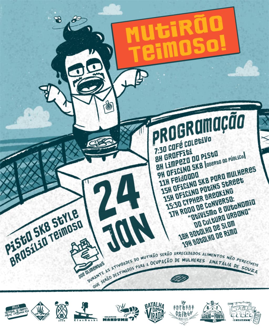 No próximo dia 24 de janeiro, a Pista de Skate da Praia, localizada em frente à Brasília Teimosa, será ocupada pelo Mutirão Teimoso, uma ação cultural coletiva que reúne diferentes expressões da cultura urbana com foco no ativismo, autonomia e fortalecimento comunitário.
