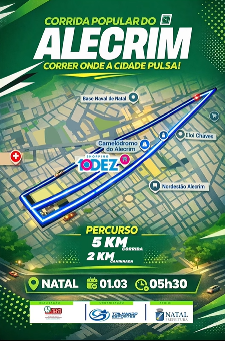 O maior bairro comercial do Rio Grande do Norte, também vai ser palco para uma corrida de rua. Estou falando da 1ª edição da Corrida Popular do Alecrim que promete movimentar as ruas da cidade com muita energia, inclusão e espírito esportivo. O evento acontece no dia 1º de março, a partir das 5h30, com Largada/Chegada na Rua Leonel Leite, 1377- Alecrim – Natal. A edição de estreia vai contar com as categorias: Corrida 5km – Geral (Masculino e Feminino) e Caminhada 2 km, além de espaço para atletas PCDS – (Cadeirantes e demais categorias).