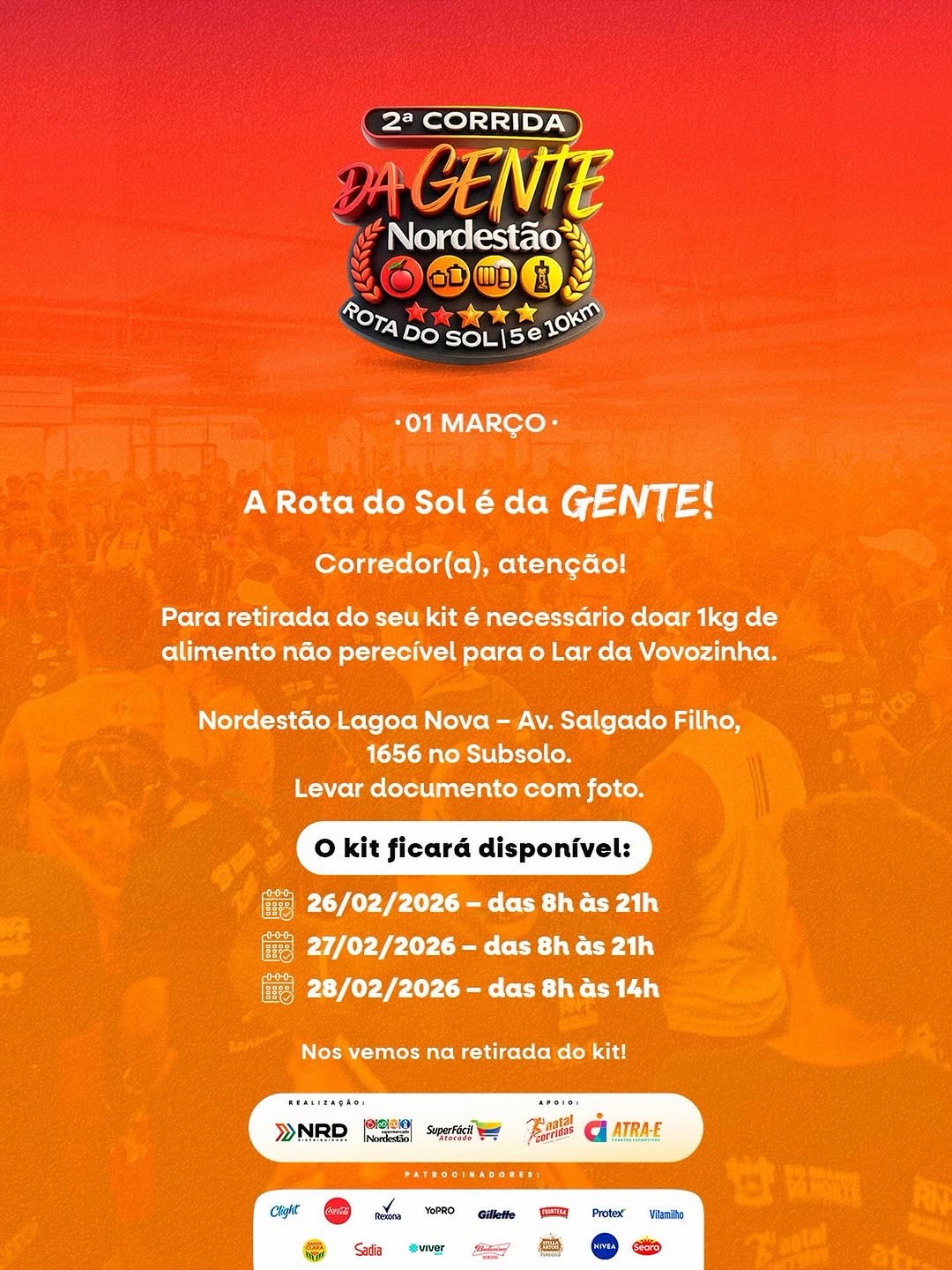 A entrega dos kits acontecerá no Nordestão Lagoa Nova (subsolo), localizado na Avenida Salgado Filho. Os participantes poderão fazer a retirada na quinta e sexta-feira, das 8h às 21h, e no sábado, das 8h às 14h. Para retirar o kit, é necessário apresentar documento com foto e doar um quilo de alimento não perecível.
