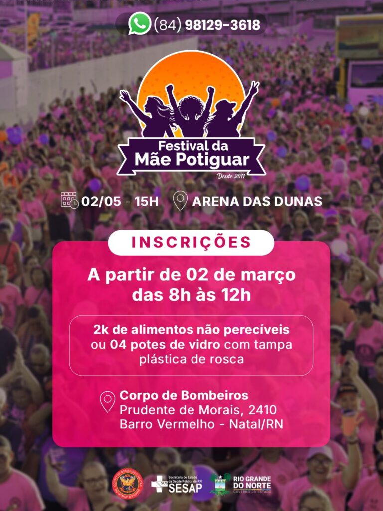Está chegando a hora do Festival da Mãe Potiguar! O evento será realizado no dia 2 de maio, às 15h, na Arena das Dunas. E as interessadas em participar desse evento que mistura, esporte, lazer e muita qualidade de vida as inscrições começam nesta segunda, 2 de março, das 8h ao meio-dia, e seguem até acabarem as camisas.