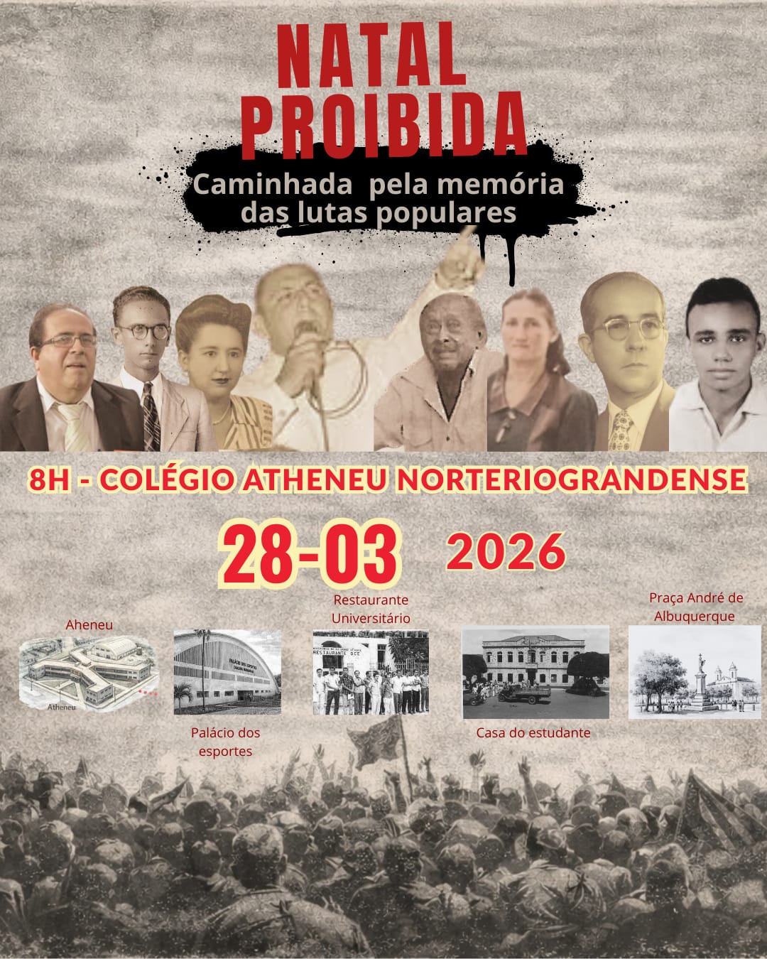 Natal tem histórias que quase nunca aparecem na versão oficial da cidade. Por trás de praças, escolas e prédios do centro existem episódios de luta, mobilização popular e resistência que marcaram profundamente a história potiguar. A caminhada Natal Proibida convida você a percorrer alguns desses lugares e conhecer a cidade a partir da memória das lutas do povo. O percurso passará por pontos históricos como o Atheneu, Vila Cincenatti, antigo Restaurante Universitário, 21º BC, Casa do Estudante e Praça André de Albuquerque.
