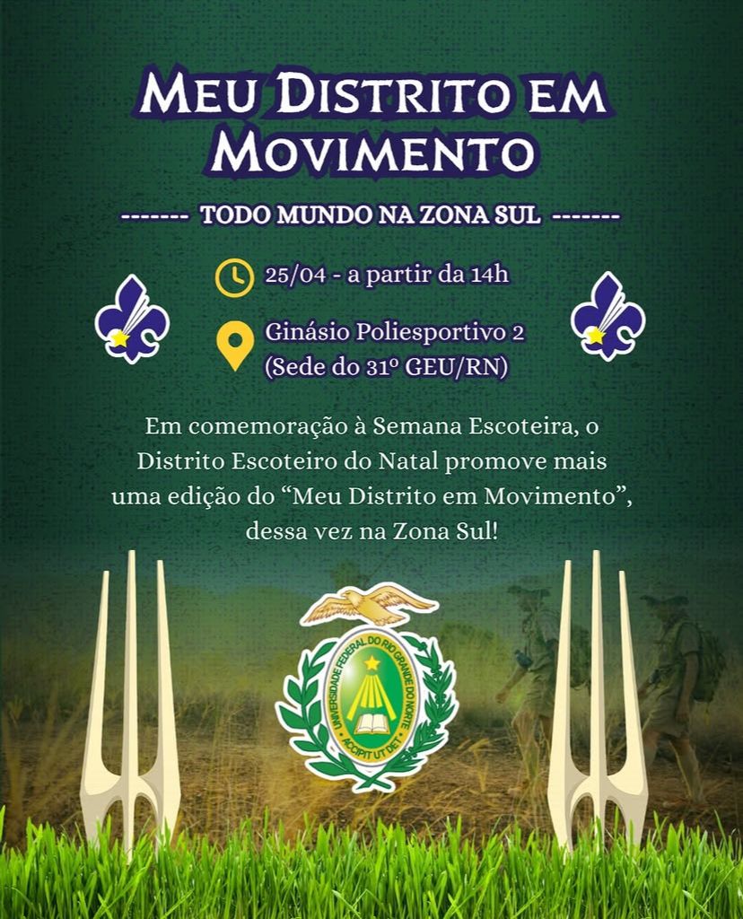 Em comemoração à Semana Escoteira, será realizado no próximo dia 25 de abril o evento “Distrito em Movimento”, uma grande celebração do escotismo que reunirá cerca de 400 escoteiros de diversos grupos do Distrito de Natal.